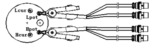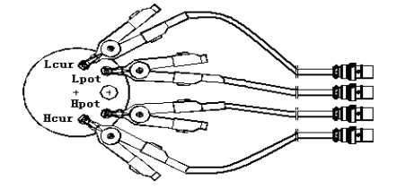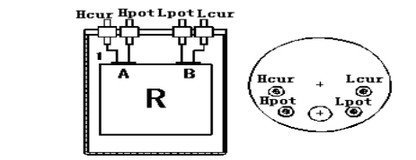 常用电阻标准器如下图所示,有四个测试端。Hcur和Lcur为电流激励端。Hpot和Lpot为电压采样端。电阻引线端A、B至测试端用导线相连。